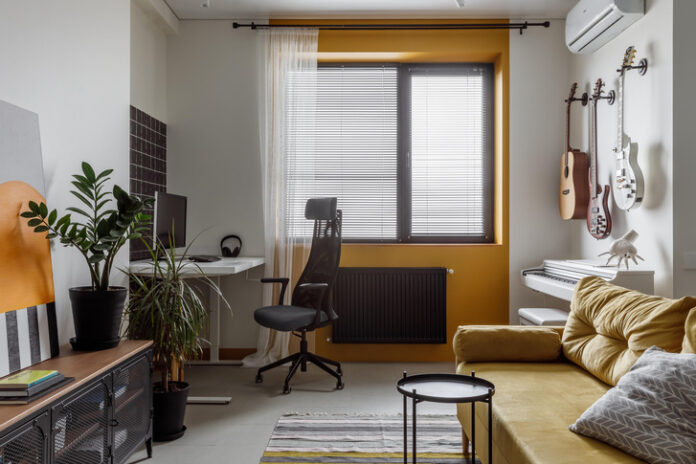 Справа от ТВ-тумбы — рабочее место хозяина квартиры.