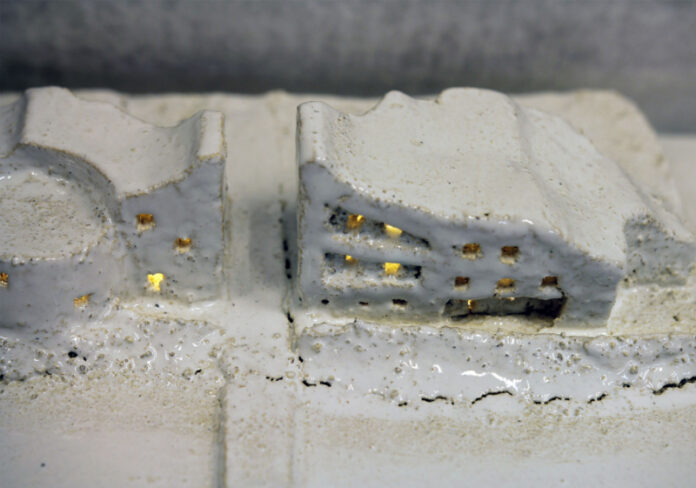 Подтверждаем: проекты новых и «старых» лет следуют одному курсу, эстетизируют всё, от материала до идеи, смело показывают почеркушки наряду с внушительными альбомами исследований (исследуют и цветы, и грибы, и архитектуру XVII века, и многое еще). Две новации 2023 года – в студии основателя МАРШ Евгения Асса, чьей темой было изучение границ, присутствует проект, в котором боты искусственного интеллекта строят и перестраивают пространства для людей-исследователей. Это самый «нематериальный» сюжет. А самый «материальный» встречает нас на входе: руками бакалавров первого года изготовлены фрагменты конструкций в натуральную величину, своего рода мокапы, в которых утеплитель сочетается с деревянной черепицей-гонтом или с разнотоновыми, побитыми то ли временем, то ли искусственной патиной досками. Студия Михаила Лабазова, с другой стороны, исследовала Верею целиком и предложила проекты для нее. Словом, как всегда в МАРШе, градиент сюжетов и степени оптического приближения – от рассматривания материи в лупу до воспарения в нейросетевые абстракции или просто поэтические эмпиреи – демонстрирует размах и завидную устойчивость основных принципов школы.