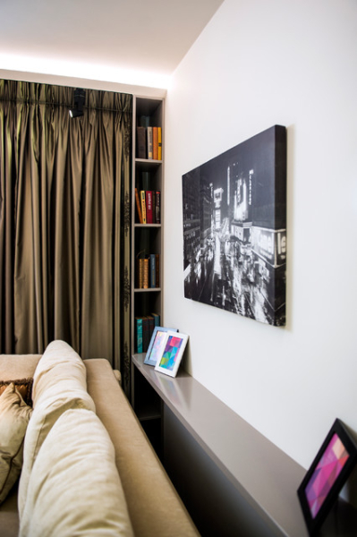 В этом случае следует продумать вопрос открывания штор — если полка глубока и сильно отступает от поверхности стены, обычные шторы не подходят (содержимое полки будет просто напросто выпирать из-под занавесок). Удобнее повесить рулонные шторы.Вариант, при котором отказываться от штор не придется — полки или узкие стеллажи, расположенные по бокам от окна прямо возле стен. Конечно, лучше устанавливать их до того, как вешать карниз. Но в крайнем случае можно просто не подводить шторы вплотную к стенам.