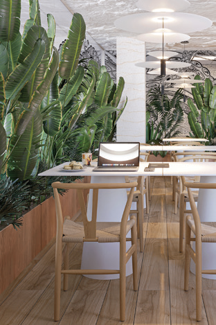 Все это подкрепляется новым дизайн-проектом, где Bazaykin Design сделали упор на натуральные материалы и теплую цветовую гамму — от молочного до кофейно-коричневого. Среди материалов отделки можно увидеть деревянный шпон, гибкий камень и большое количество зелени.