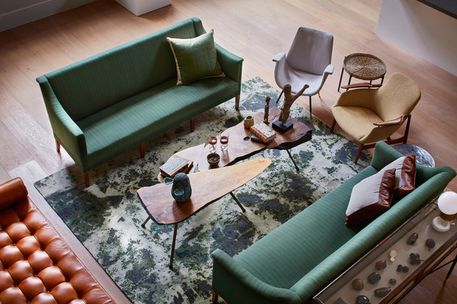 Между ковром и мебелью нужно оставить значительный зазор, если речь о ковре с ярким крупным рисунком. Чем сильнее контраст между цветом ковра и цветом мебели, тем больше должно быть расстояние. Иначе цвета будут слишком конфликтовать: представьте пестрый шарф на яркой, с рисунком, рубашке.